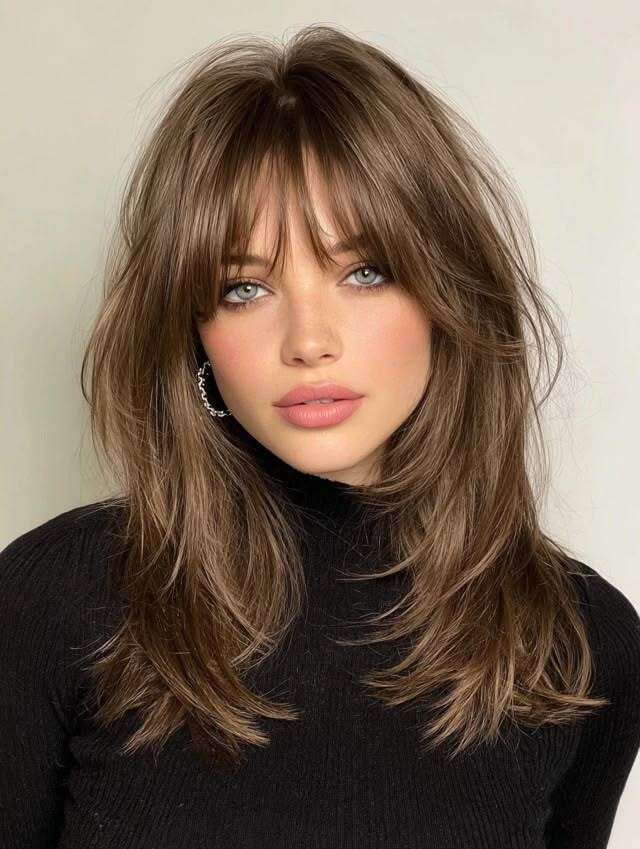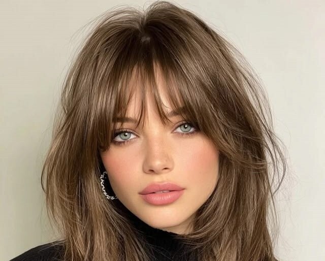 - Обязательная челка (шторка или полупрозрачная), которая мягко обрамляет лицо;
